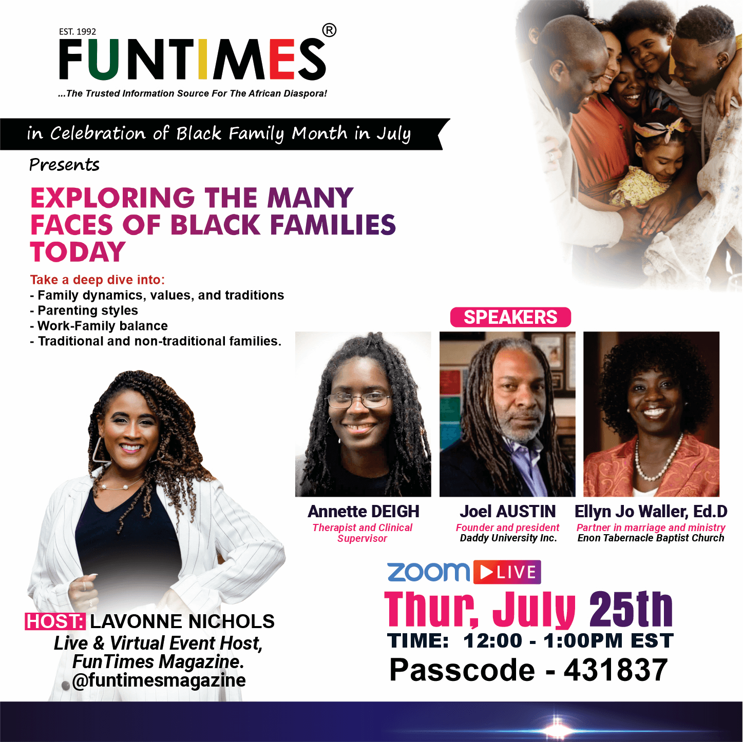 Many of our priorities center around family. That’s why FunTimes Magazine created an engaging virtual event, Exploring the Many Faces of Black Families on July 25, 2025 during National Black Family Month (observed in July). The enlightening and educational virtual ZOOM session focused on family values, traditions, parenting styles, work-family balance, family dynamics, and traditional and unconventional families. Our distinguished and lively panel of educators and experts -- Dr. Ellyn Jo Waller, Annette Deigh and Joel Austin -- shed a sharp light on the state of family living. The event was moderated by multi-media host Lavonne Nichols. The discussion was so riveting, it could have gone on way past the designated one-hour limit....